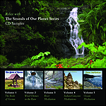 The "Sounds of Our Planet" series is dedicated to preserving and sharing natural sounds that one might find relaxing, intriguing, uplifting and fascinating. The listener is invited to enjoy these recordings for background ambience, for study, for centering of spirit or simply for amusement. These recordings are made with care to retain a natural feel so the listener can truly experience "being there" simply by playing a CD. We sincerely hope you enjoy this series and give us feedback on the sound quality, content and any suggestions for future projects. First in the series is "The Birds of Verona" which represents the first 48 minutes of birdsong recorded at a flyway for migratory birds in S. Burlington, Vermont during the peak of summer 1975 just as the sun was rising. Second in the series is "Wind Chimes in the Rain" a 78 minute recording of a heavy rainstorm in Modesto, California recorded in February 1986. This 3 dimensional recording puts the listener in the middle of a heavy rainfall with occasional ambient sounds from wind chimes and distant midnight trains. ***NEW*** "Wind Chimes in the Rain" has been featured on NPR's "Living on Earth" program as the "EarthEar" of the week selection. Click here to listen to the program. Third in the series is "River Meditation" a 79 minute recording of the San Luis Rey River in the Cleveland National Forest. This 3 dimensional recording puts the listener right at the bank of this lovely river! With the release of this CD, Sounds Of Our Planet series moves from remastering vintage environmental recordings to creating new masterpieces using state-of-the-art recording technology. Fourth in the series is "Indian Canyons Meditations" a special 2 CD collection! These two recordings were made of a mountain stream and a waterfall at Indian Canyons Desert Oasis California. You can beat the summer heat with these CDs, a fan and a cool drink. Come to the oasis! Fifth in the series is "Ocean Meditation - Midnight at Sunset Cliffs" a 78 minute recording of the Pacific Ocean from San Diego's noted "Sunset Cliffs" recorded at midnight. Take a dip in the sonic seas! |